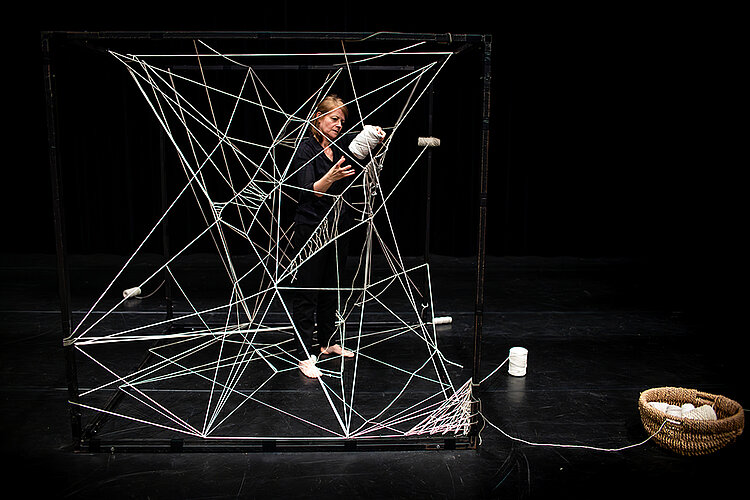 Un dialogue entre un cube évidé, une danseuse et des fils, sans narration, d’action en action. Le fil va d’un point à un autre, forme un nœud, un angle, rejoint un autre fil puis un autre et une toile se dessine, prend forme à l’intérieur du cube.