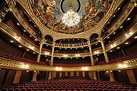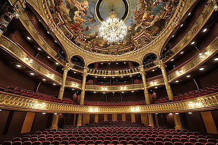La salle de spectacle du Grand-Théâtre d'Angers, aménagée par Auguste Magne, adopte le plan en fer à cheval des grandes salles à l'italienne. Son plafond monumental, peint par l'Angevin Jules-Eugène Lenepveu, met en scène les quatre éléments dans une composition baroque et spectaculaire, parfaitement accordée aux passions du théâtre.