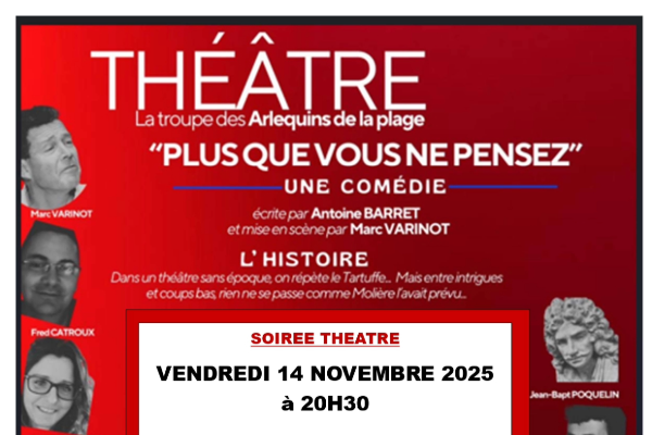 Dans un théâtre sans équivoque, on prépare Tartuffe….Techniciens et comédiens sont à la peine, sous la pression d’un actionnaire intransigeant et d’une metteuse en scène très en difficulté. Intrigues personnelles, revendications salariales et personnages burlesques perturbent les répétitions. Pièce interprétée par la compagnie LES ARLEQUINS DE LA PLAGE