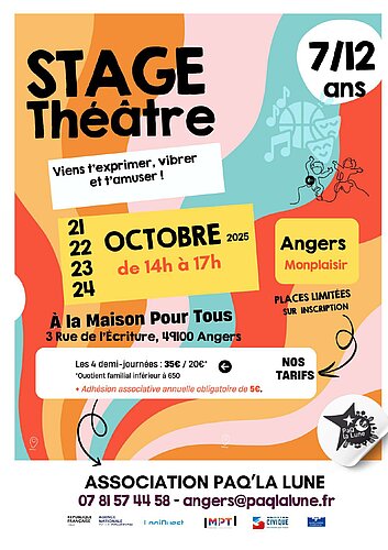 L'association Paq'la Lune propose aux jeunes de 7 à 12 ans un stage théâtre pendant les vacances de la Toussaint du mardi 21 au vendredi 24 octobre à la MPT.