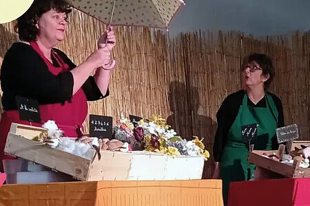 « LES PETITES MARCHANDES – Nouvel arrivage », joué par deux comédiennes-conteuses, est constitué de 5 histoires qui mêlent théâtre d’objets et oralité. Ce spectacle, d’une durée de 40 minutes environ, s’adresse tout autant aux enfants à partir de 3 ans qu’aux adultes qui les accompagnent. La complicité entre les deux comédiennes entraîne le public à participer.