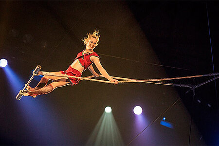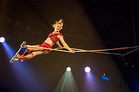 Le spectacle explore la suspension du temps : celle des corps en vol, des voix qui s’élèvent, de la lumière qui glisse sur la pierre. Comme des poussières d’étoiles, les artistes - danseuses aériennes, chanteurs, musiciens - viennent révéler les volumes de la collégiale, la peupler de vibrations humaines, de souffles et de gestes suspendus.