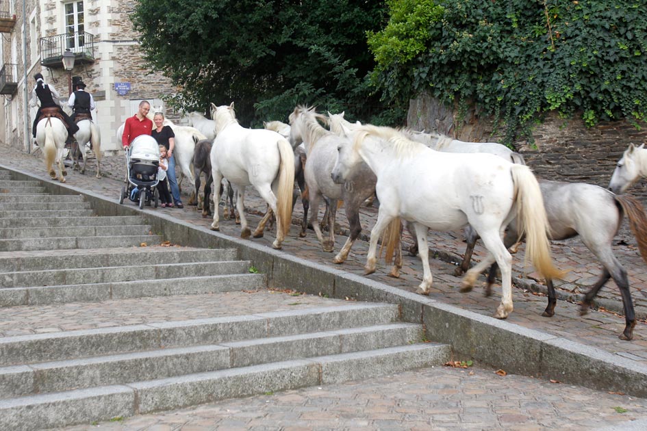 Trente juments de Camargue conduites par leurs "guardians": c'est la manade dans la montée Saint-Maurice. (Photo: Thierry Bonnet/Ville d'Angers)
