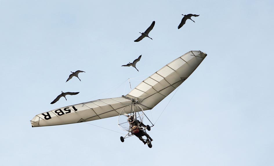 Survol de la Maine par des grues d'Afrique guidées par Christian Moullec, rendu célèbre par le film Le Peuple migrateur. (Photo: Thierry Bonnet/Ville d'Angers)