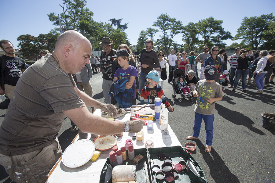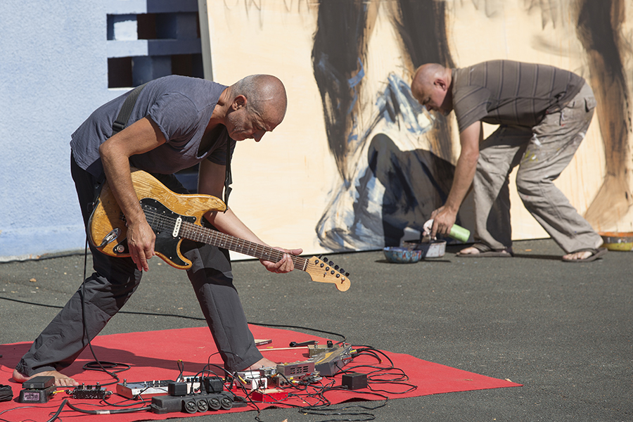 Ligne de Front. Paul Bloas, artiste peintre, colle ses géants de papier accompagné par les improvisations de Serge Teyssot-Gay, ancien guitariste de Noir Désir. (Photo: Thierry Bonnet/Ville d'Angers)