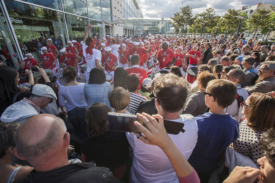 Quarante percussionnistes et une vingtaine de cuivres: c'est le Bloco Chango à la gare Saint-Laud. (Photo: Thierry Bonnet/Ville d'Angers)