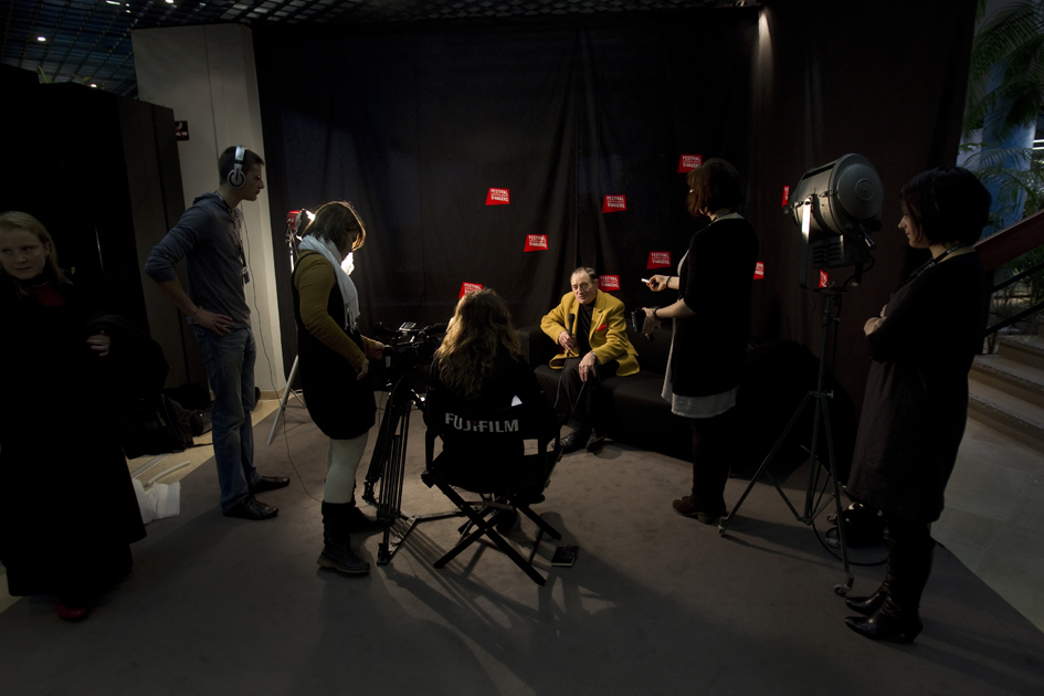Pierre ETAIX, interviewé par l'équipe "Focus" du magazine TV du Festival. Dimanche 23 janvier 2011. (Photo: Thierry BONNET/Ville d'Angers)