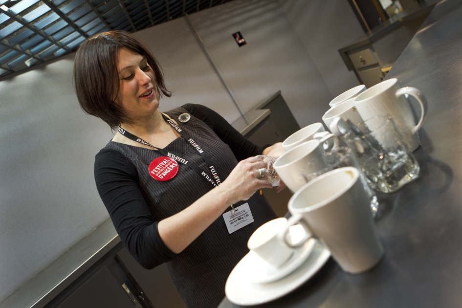 Pauline est bénévole rattachée au groupe partenariat. Ses tâches: accueillir, contrôler, renseigner professionnels et partenaires. Le soir quand tout le monde quitte le Festival, elle termine sa journée par la vaisselle dans la joie et la bonne humeur. Jeudi 27 janvier 2011. (Photo: Thierry BONNET/Ville d'Angers)