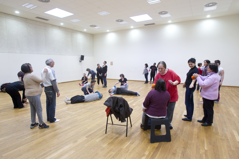 Inscrits parmi les bénéficiaires de sept associations d'entraide, les 55 participants s'initient à la danse contemporaine après avoir vu "Rêves dansants", le matin. Une découverte pour la plupart, un moment de grâce pour tous. (Photo: Thierry BONNET/Ville d'Angers)