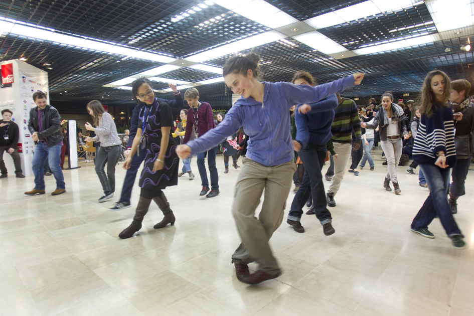 Deuxième Flash mob de la semaine, avec une surprise. Kamen Kalev (membre du jury) au fond à gauche avec la chemise mauve. (Photo: Thierry BONNET/Ville d'Angers)