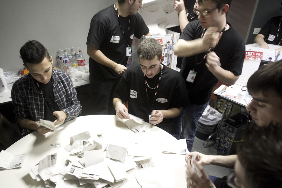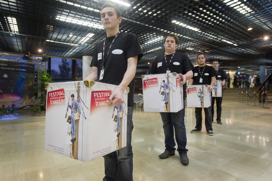 Plusieurs fois par jour Nicolas, Kevin, Julien et Cédric du Lycée Polyvalent Chevrollier d'Angers sont chargés d'installer et récupérer les urnes pour le vote du public. (Photo: Thierry BONNET/Ville d'Angers)