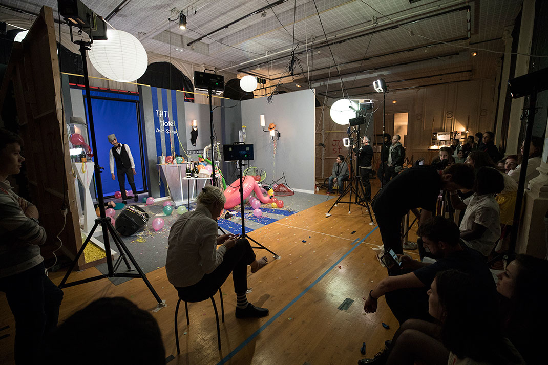 Décor et cinéma, installation et tournage. Quatre espaces scénographiés dans les studios Bodinier, pour plonger au cœur de Palm Springs, interprétation de l’univers de Jacques Tati. (Photo: Thierry Bonnet/Ville d'Angers)