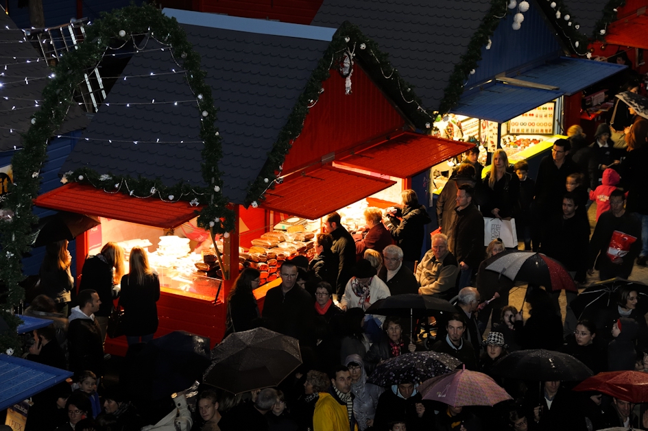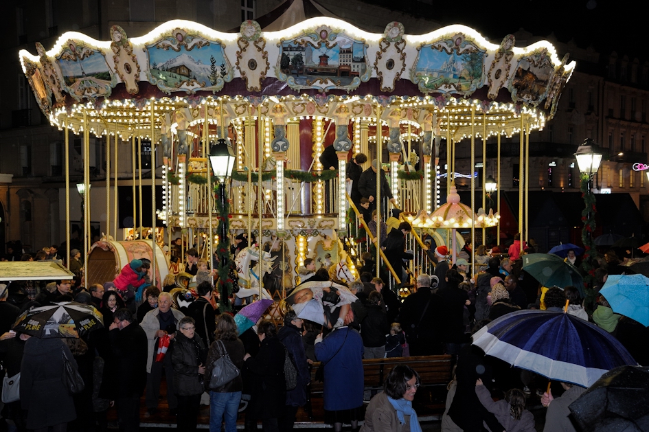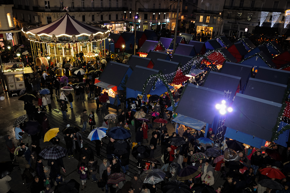 En dépit d'une pluie incessante, de nombreux Angevins ont déambulé en centre-ville le samedi 3 décembre, pour le premier jour de Soleils d'hiver. Ici, place du Ralliement, pour le lancement officiel du marché de Noël. (photo: Jean-Patrice Campion)