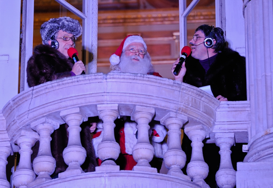 Au balcon du Grand-Théâtre, le Père Noël interviewé par le journaliste envoyé spécial Roland Crouillard et son équipe de télévision. (photo: Jean-Patrice Campion)