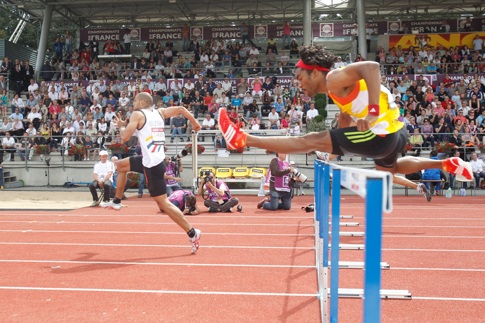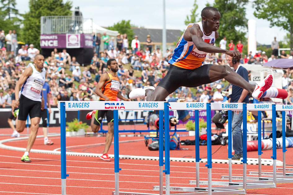 Mamadou Hanne Kasse, athlète sénégalais invité aux championnats de France, s'impose en 400m haies. Le titre revient à Heni Kechi, deuxième de la course en 49"91. (Photo: Thierry Bonnet/Ville d'Angers)
