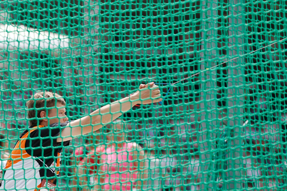 Concours féminin du marteau. Pourtant recordwoman de France, Manuela Montebrun doit se contenter de la sixième place, avec 65m61. Stéphanie Falzon s'impose, avec 70m57. (Photo: Thierry Bonnet/Ville d'Angers)