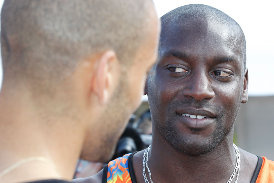 Passage de relais entre ancien et nouveau champion de France: Ladji Doucouré (de face) et Garfield Darien. (Photo: Thierry Bonnet/Ville d'Angers)