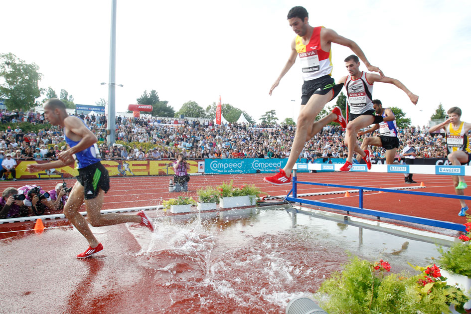 Au moment de franchir la rivière, Mahiedine Mekhissi-Benabbad (au centre) n'est pas encore en tête. Il sera pourtant en or à l'arrivée du 3000m steeple, avec 8'27"80. (Photo: Thierry Bonnet/Ville d'Angers)