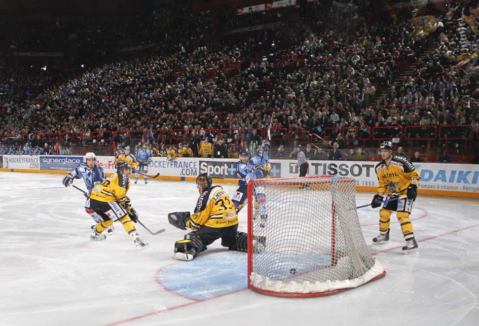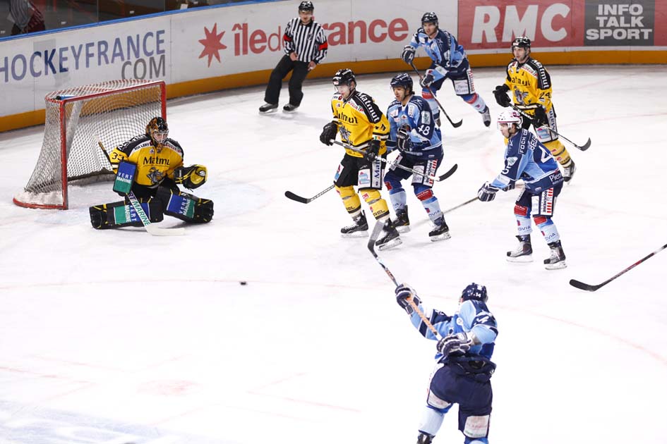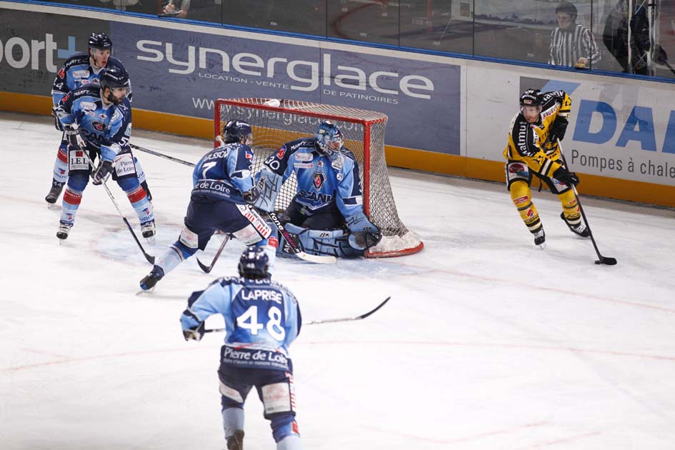 Ici derrière la cage des Dragons, Marc Belanger est l'auteur du premier but angevin, inscrit au début du deuxième tiers-temps. (Photo: Thierry Bonnet/Ville d'Angers)