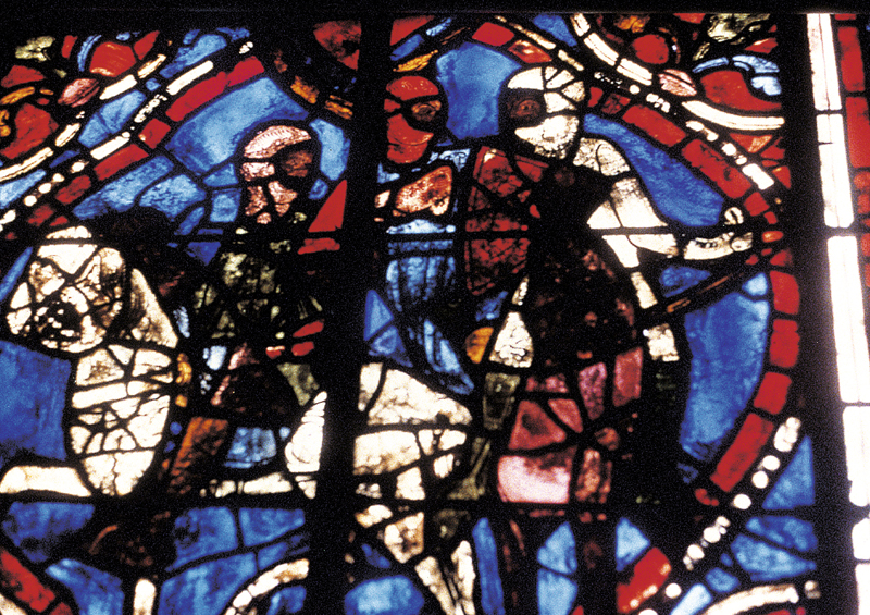 Le plus ancien vitrail conservé date approximativement de 1165 et représente l'Enfance du Christ (n° 1). À la fin du XIIe siècle, sous l'épiscopat de Raoul de Beaumont, de nouveaux vitraux furent refaits pour la nef, dont il reste le martyre de sainte Catherine d'Alexandrie (n° 2), la Dormition de la Vierge (n° 3) et le martyre de saint Vincent (n° 4), exemples remarquables de la peinture sur verre de cette époque. Le choeur possède plusieurs vitraux du XIIIe siècle comme celui de saint Jean- Baptiste (n° 12), certains commandés par l'évêque Guillaume de Beaumont comme l'attestent sa figure en donateur (Vie de saint Julien, n° 8) ou ses armoiries (Vie de saint Thomas Becket, n° 11). Cet ensemble n'est pas homogène et mêle vitraux du XIIe siècle (Vie de saint Martin, n° 9), verrières du XVIe siècle provenant du prieuré du Verger à Seiches-sur-le-Loir (n° 7 et 10) et oeuvres des années 1230-1235, créées pour le choeur et le transept. Ces vitraux témoignent de la vitalité du foyer artistique angevin à cette époque. À la suite d'un incendie en 1451, on commanda à André Robin des vitraux représentant des saints debout sous des dais architecturés (n° 6). Les deux roses (n° 5 et 13), également d'André Robin, comportent la figuration des signes de la fin des temps, une iconographie développée dans les manuscrits au milieu du XVe siècle, mais très rare dans le vitrail. En 1944, une partie des anciens vitraux, déjà très lacunaires au XIXe siècle, fut soufflée par une bombe. On confia la restauration dans les années cinquante au peintre verrier parisien Jacques Le Chevallier qui créa de nouveaux vitraux pour la nef représentant des saints vénérés dans le diocèse.