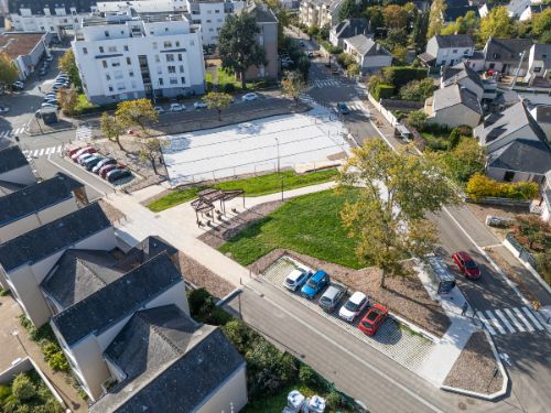 Les espaces extérieurs ont été complètement revus : parvis d’entrée du groupe scolaire végétalisé, cour de récréation, stationnements, etc.