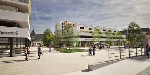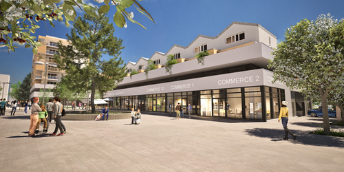Sur la place, le centre commercial sera reconstitué sur 3 000 m², sous forme de deux immeubles intégrant des logements et dotés de parkings souterrains privés.