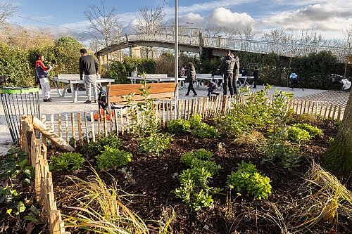 Posée fin 2025 au-dessus de la voie de chemin de fer, une nouvelle passerelle entrera en service au printemps 2026 pour relier les parties est et ouest du parc. Les espaces verts et les cheminements piétons et cyclistes seront réaménagés.