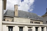 | Elévation sur cour de l'avant-corps de la façade principale, partie supérieure, vue depuis la rue Saint-Martin, avec la partie basse centrale de l'élévation postérieure au premier plan. |