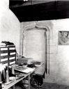 | La chapelle, oratoire seigneurial : mur ouest avec la cheminée. |