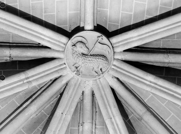 | Angers, Centre-ville (quartier), Parvis-Saint-Maurice (rue) 5, 7, Couvent de soeurs de la Sagesse, actuellement immeuble de bureaux et demeure | La chapelle : la clé de voûte du choeur figurant l'agneau mystique. |
