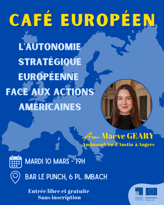 Ce Café européen sera sur le thème "L'autonomie stratégique européenne face aux actions américaines" et sera animé par Maeve Geary, Ambassadrice d'Austin à Angers.