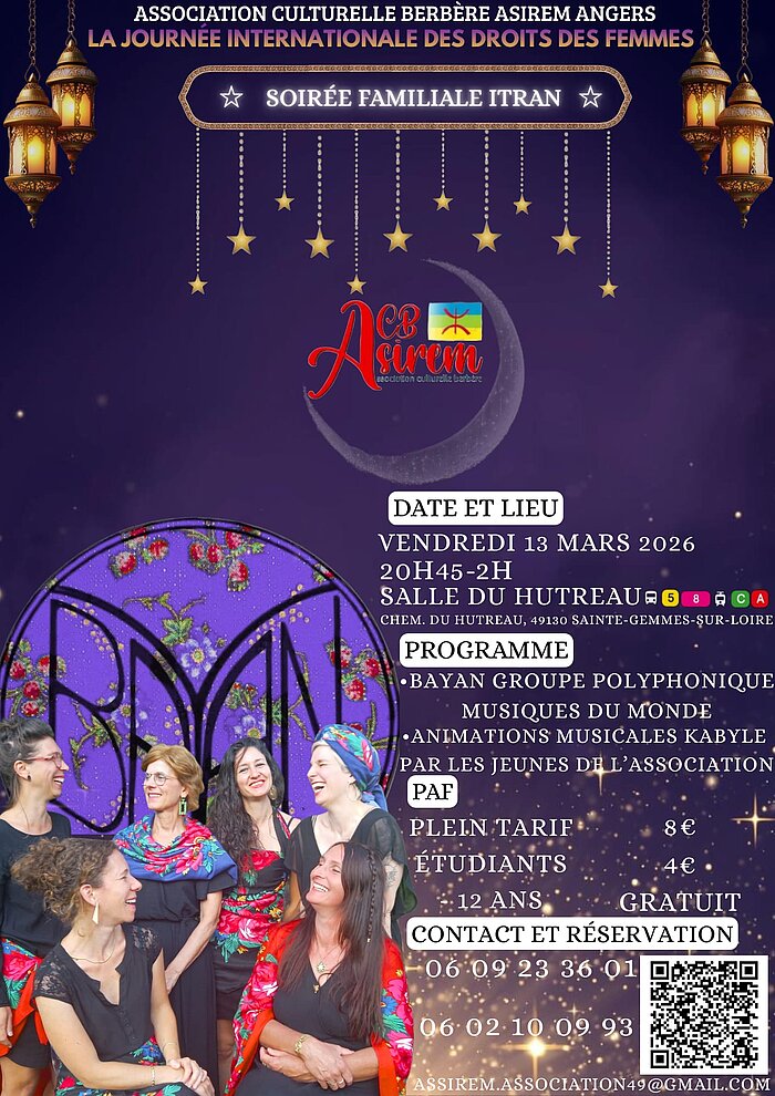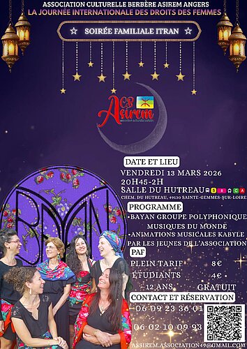 A l'occasion de la journée internationale des droits des femmes, l'association ASIREM ANGERS organise un concert animé par BAYAN, groupe polyphonique qui interprète les musiques et chants du monde.