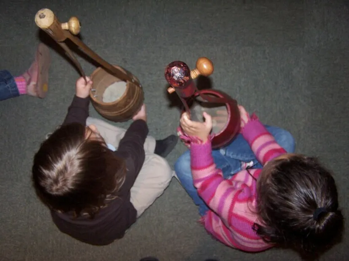 Chaque duo adulte-enfant est invité à explorer les instruments et la voix à travers des jeux sonores collectifs.