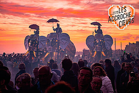 Sortis tout droit de la boîte à jouets du fils de Gargantua, trois éléphants mécaniques en compagnie d'une escadrille de Phénix métalliques traversent la ville, au son des cornemuses, bombardes et tambours d'une petite armée de soldats de plomb.