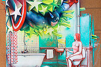 Bien que leurs pouvoirs soient illusoires, les super-héros des mythologies modernes nous incitent à croire en quelque chose de meilleur pour nous-mêmes et pour la société. Ils incarnent la démesure d’une force incontestable et invincible. Dans cette série de toiles peintes Héros-Mythos, l'auteur démystifie avec humour les images trop parfaites de ces faux dieux. Il démasque un salut qui n’en est pas un et qui interroge notre humanité vulnérable mais précieuse.