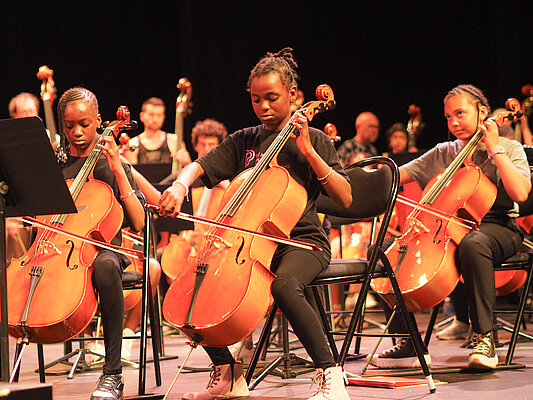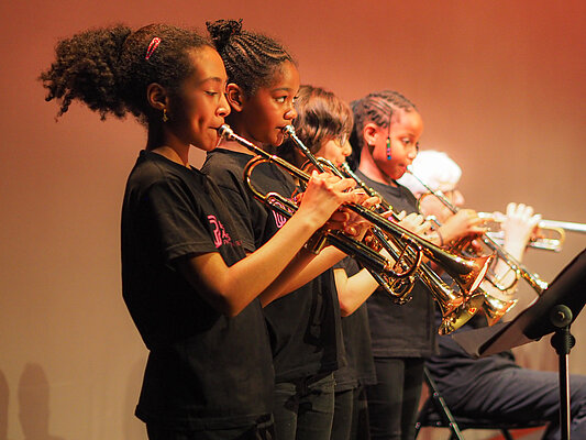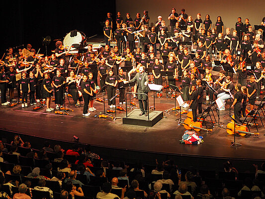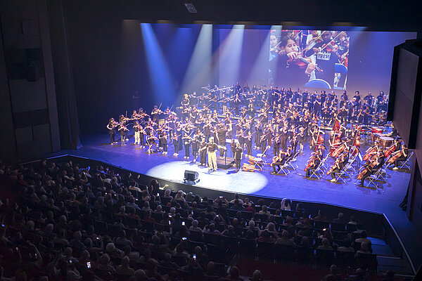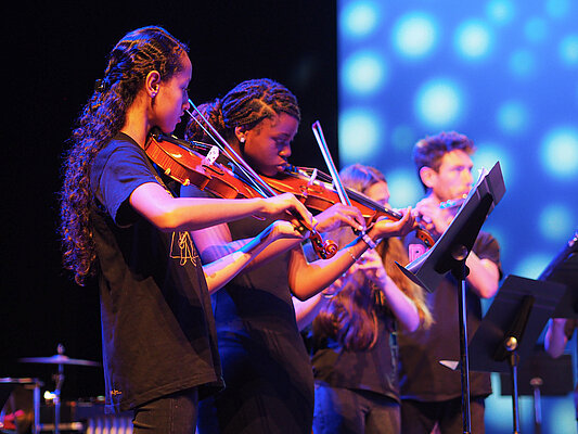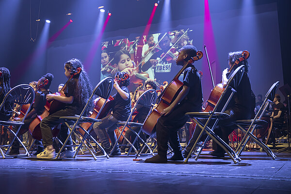 Chaque enfant se voit confier un instrument de musique pendant trois ans. Encadré par des professionnels de la musique et du champ social, il suit deux cours collectifs par semaine et retrouve tous les mois les autres enfants du territoire pour une répétition en orchestre. Un grand concert est organisé en fin d’année au théâtre Le Quai.