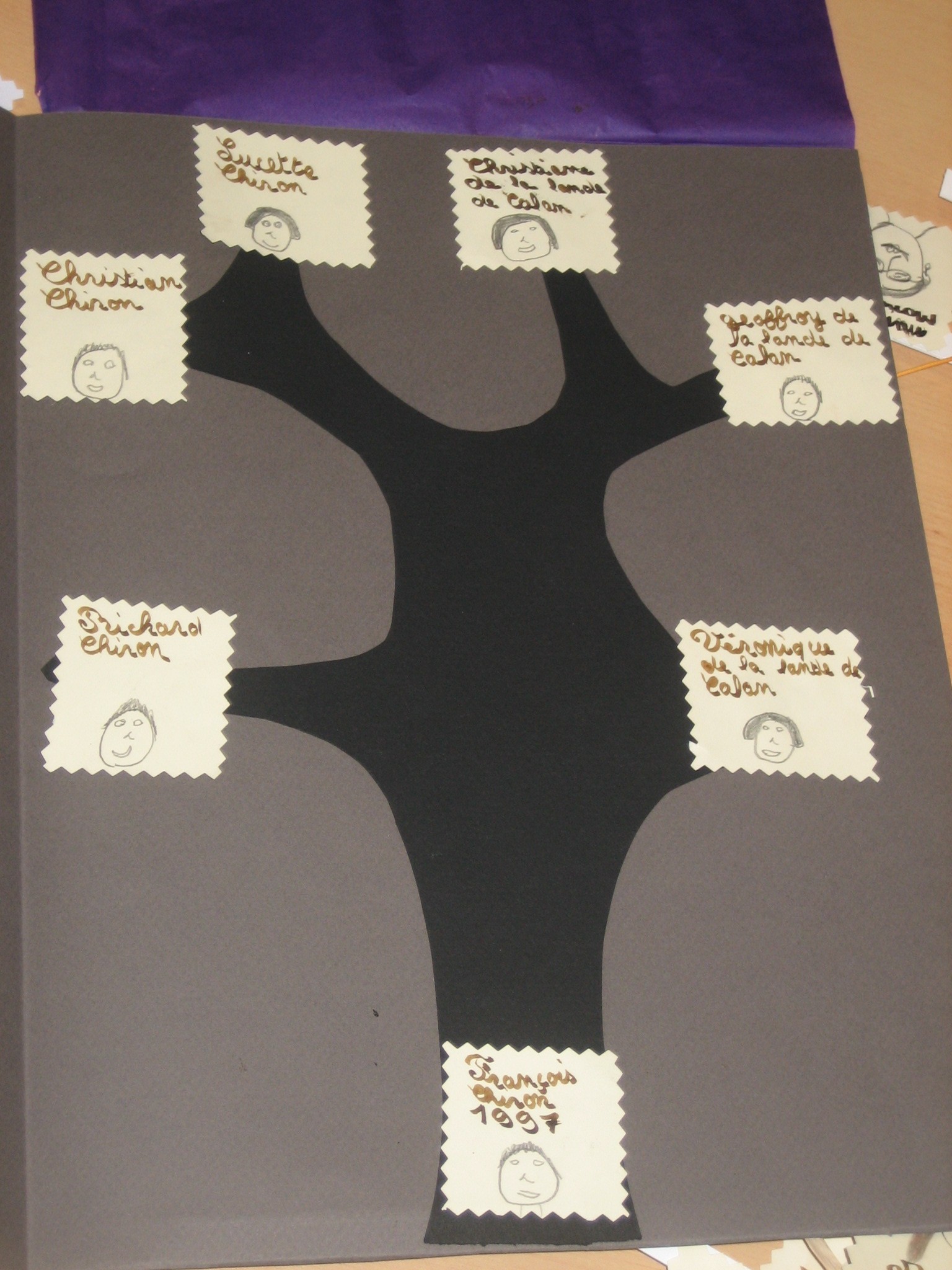 L’après-midi est réservé à la réalisation d’un arbre inspiré des modèles de généalogies vues le matin. Les élèves peuvent travailler sur leur propre famille ou bien sur des généalogies de rois, des arbres de classement de quartiers…