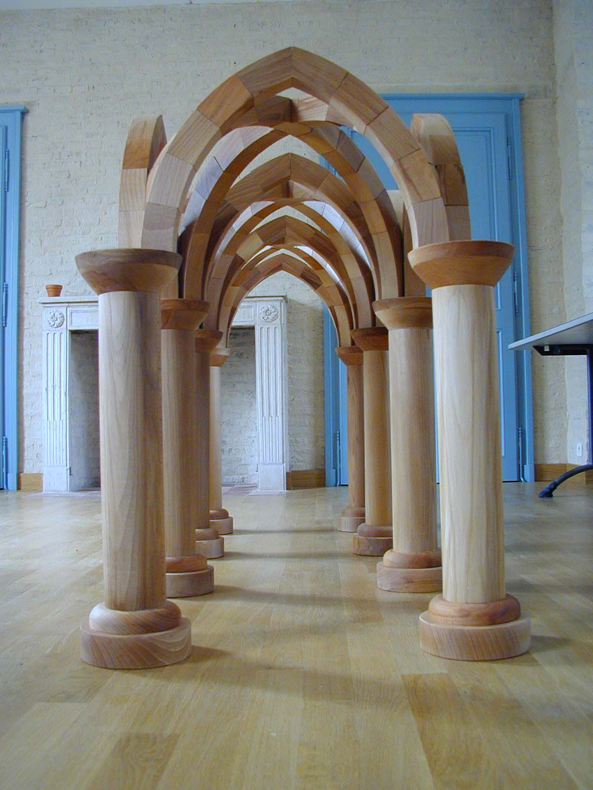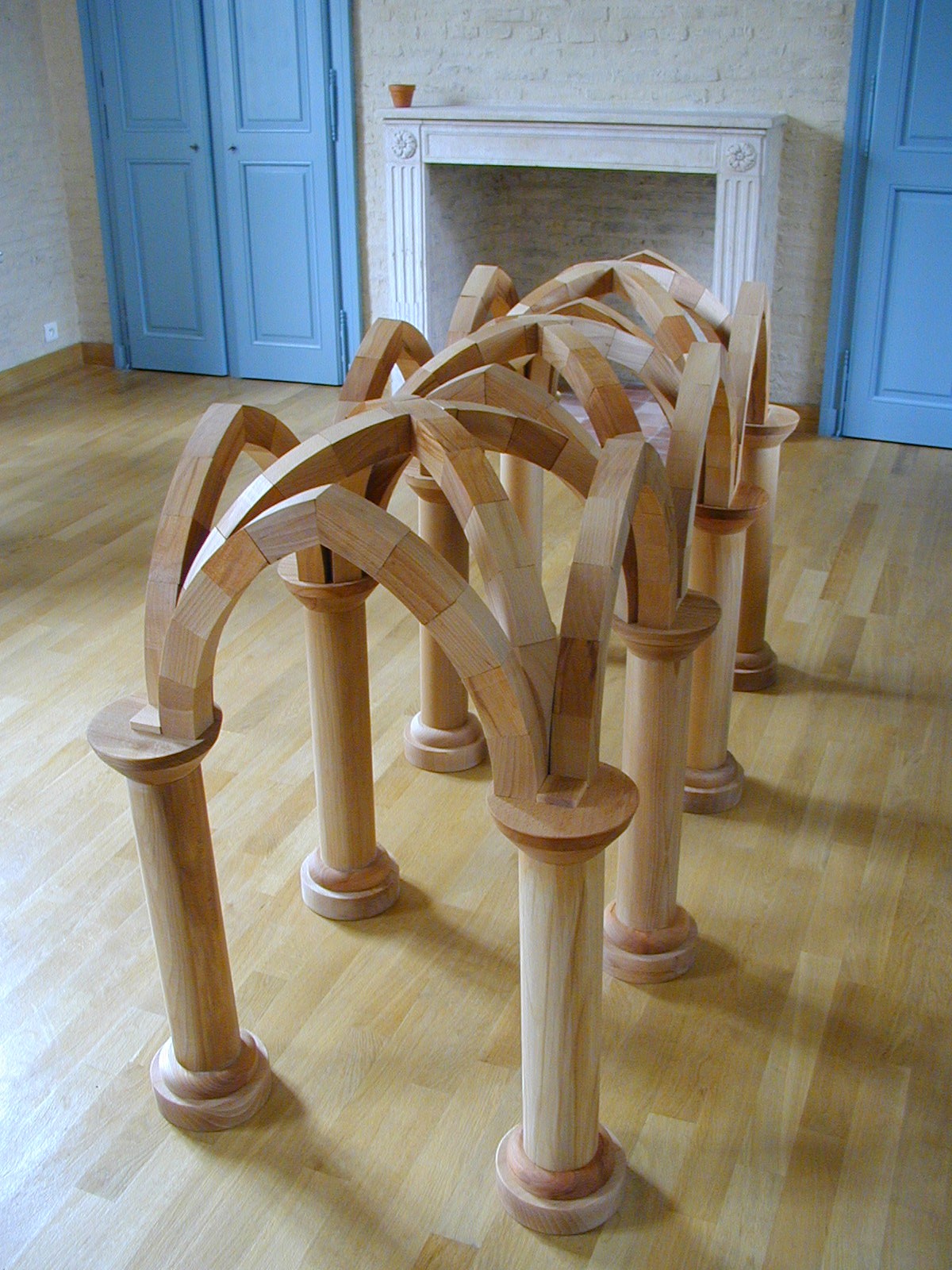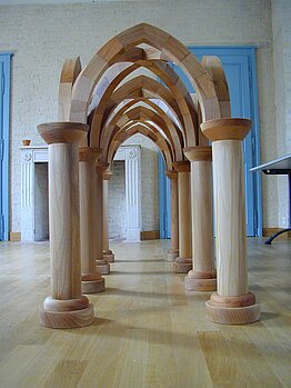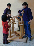 A l’aide d’un jeu de construction de voûtes gothiques angevines en bois, les élèves sont amenés à monter des voûtes, un mur et des contreforts afin d’appréhender les qualités architectoniques de ce style et ils construisent aussi une maquette de maison à pan-de-bois. Cette activité est complétée par un atelier sur les constructeurs du Moyen Âge qui permet de découvrir l’organisation des chantiers de construction.