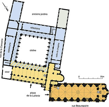 Seule élévation visible place de la Laiterie, la façade sud de l’abbatiale, en petit appareillage de grès, est rythmée par l’alternance de puissants contreforts plats et de grandes fenêtres. L’entrée actuelle de l’église est récente. L’accès principal s’effectuait primitivement par la façade occidentale rue de la Censerie, précédée d’une cour d’entrée signalée par un beau portail du XVIIe siècle. Une seconde porte, dans le bras sud du transept (dont l’extrémité supporte la tour du clocher côté place) est refaite au XVIIIe siècle. Elle servait lors de la procession de la Fête-Dieu qui se déroulait entre la cathédrale et le Tertre Saint-Laurent. Une longue nef du XIe siècle, bordée de collatéraux ouvre sur un transept saillant et un choeur à plan bénédictin*. Ces parties orientales ont beaucoup souffert depuis l’effondrement des voûtes au début du XIXe siècle ; elles sont actuellement en cours de restauration. Seule subsiste entièrement l’absidiole* sud englobée dans l’église de la Trinité. La nef, mieux conservée, présente un couvrement particulièrement original. Couverte d’un berceau plein-cintre rythmé par des arcs doubleaux*, elle constitue l’une des premières expériences en France de voûtement d’un vaste volume. Cette voûte est contrebutée par les berceaux des collatéraux*, perpendiculaires à la voûte principale. Ce principe de construction audacieux qui reporte toutes les poussées sur les piles, permet de dégager les murs extérieurs et laisse pénétrer la lumière par de larges fenêtres.