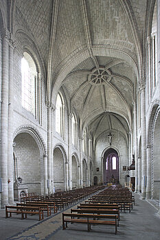 L’élan vertical de l’espace amène le regard sur les voûtes fortement bombées de style Plantagenêt, dites aussi angevines, où sont associées pour la première fois ogives et liernes*. L’intérieur étonne par la disproportion de plan et d’ornementation entre la nef, spacieuse et richement ornée, et le choeur beaucoup plus modeste. Cela peut probablement s’expliquer par le nombre de paroissiens de la Doutre, alors qu’un choeur peu développé suffisait à accueillir les quelques prêtres.