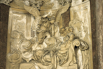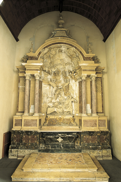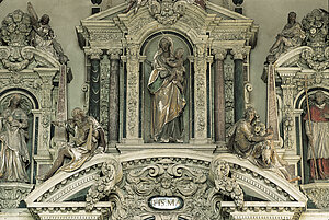 que par la dynamique baroque du groupe sculpté et de la gloire* qui le surmonte, une évolution radicale en comparaison du grand retable. D'un style ne devant plus rien à des manières locales, cet ensemble constitue une rareté en Anjou.