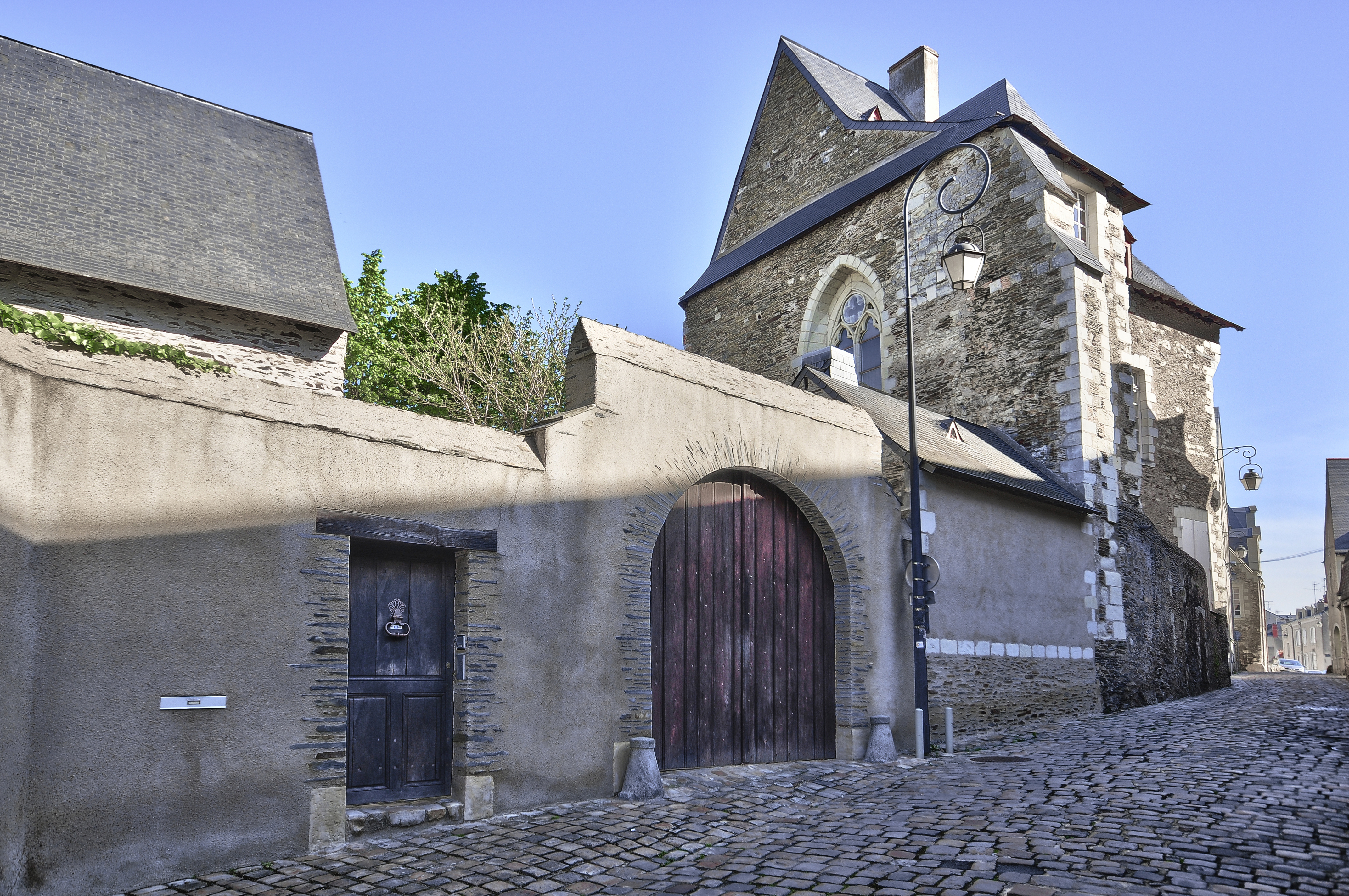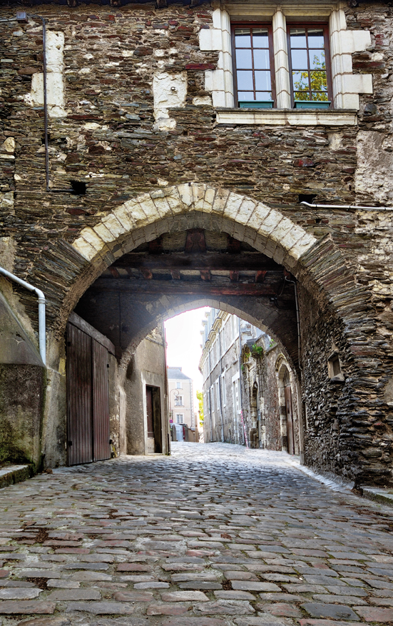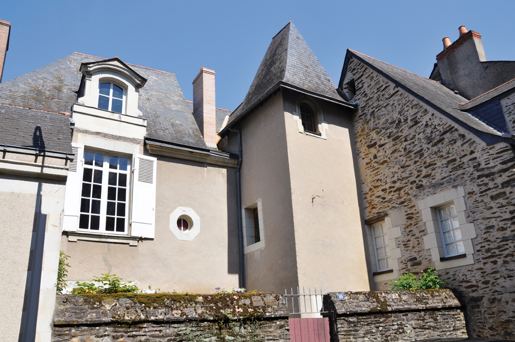 Le quartier de la Doutre, désignant la rive « Outre Maine » face au centre d’Angers, présente un patrimoine riche et diversifié. Organisé en bourg monastique à partir du XIe siècle, il se développe suite à la fondation de l’abbaye Notre-Dame de la Charité (actuelle abbaye du Ronceray).Très prospère, le quartier évolue rapidement profitant de la proximité de la rivière pour ses activités. À la demande d’Henri II Plantagenêt,l’hôpital Saint-Jean est fondé vers 1180 au nord-est du quartier. Au XIIIe siècle,cette rive droite est insérée dans la vaste enceinte de saint Louis qui enveloppe désormais toute la ville. Le quartier s’organise en deux secteurs inégaux : l’un à vocation commerçante et artisanale autour de la rivière ;l’autre plus résidentiel. Les notables angevins sont attirés vers les hauteurs du nord-ouest du quartier, par le cadre champêtre, propice à l’édification de grandes demeures. Ils délaissent donc progressivement la partie basse au profit des artisans et ouvriers.Différentes communautés religieuses suivent également ce mouvement et s’y installent, les Augustins au XIVe siècle, puis les communautés réformées du Calvaire et du Carmel. Au nord du passage de la Censerie,la présence de nombreux hôtels particuliers atteste le caractère résidentiel de ce secteur. Souvent disposés entre cour et jardin et protégés de la rue par de hauts murs de clôture, ils sont bâtis dans des matériaux locaux : le schiste et le tuffeau réservé principalement aux chaînages, corniches et lucarnes.Cette architecture de grands logis en pierre contraste avec les maisons en pans-de-bois des commerçants et des artisans largement représentées autour de la place de la Laiterie.