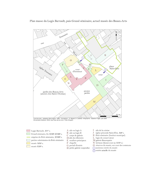 The house had a very prosperous though short history because even if this “lovely, honest and sumptuous edifice whose decoration was the reflection of the beautiful town in which it was located” saw the visit of such honourable hosts as César Borgia, during Olivier Barrault’s time, or Marie de Medicis in 1619, we know by the notary acts of the period that from the middle of the 16th century it was no longer one whole building. It was purchased by the Great Seminary in 1673, rented to the bishop during work to the Episcopal Palace around 1695, and was the object of profound alterations at the beginning of the 17th and 18th centuries. During the revolution, the building was handed over to the department of the Maine et Loire which used it to house its central school and then, later on, in 1801, a museum. In 1805 the public library ccupied the premises and then both the museum and the public library became municipal buildings, the public library remaining here until 1977. Extensive renovation work was carried out on the roofs and interiors of the Barrault mansion between 1850 and 1854. This renovation work based on the museo-graphic work of the period led to the creation of long second storey galleries lit by the noonday sun.
