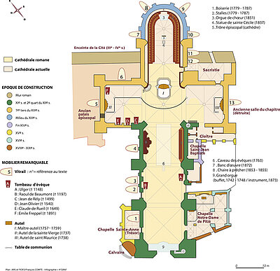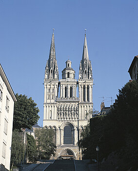 El espesor de los muros permite acondicionar una recadera (pasaje) al nivel de grandes ventanas gemelas. Con el obispo Normand de Doué (1149-1152), se comenzó con la construcción de grandes bóvedas abombadas con ojivas largas e imponentes, en un plano cuadrado de veinticinco metros de altura: las primeras de arquitectura gótica angevina. El transepto está iluminado por dos grandes rosetones y el coro, cuya obra se debe al gran obispo Guillermo de Beaumont. La iglesia fue terminada por el ábside en 1250, después de haber derrumbado el muro antiguo. La arcada de la parte inferior, los resquicios con sus estatuas en la cima de los arcos mitrales y las bóvedas, muy elevadas y finas, caracterizan esta última realización. La escultura, de forma homogénea, se limita a los modillones (soportes) de la cornisa y a los capiteles compuestos de tallos en voluta que contienen hojas de acanto pobladas de cabezas que se entrecruzan.