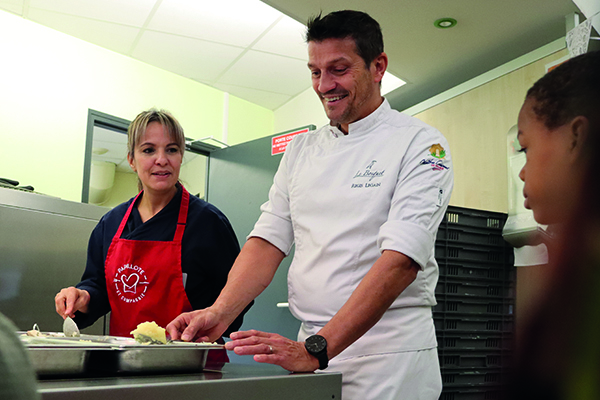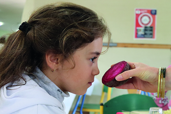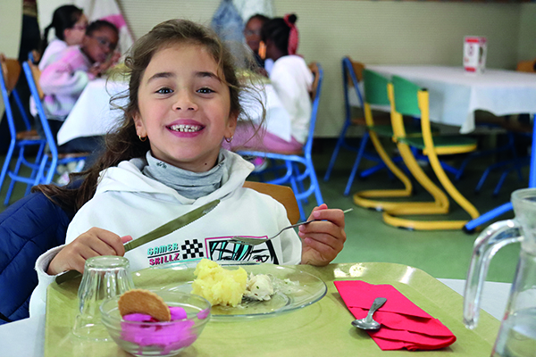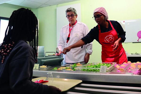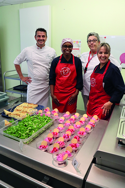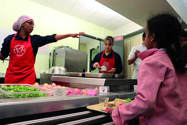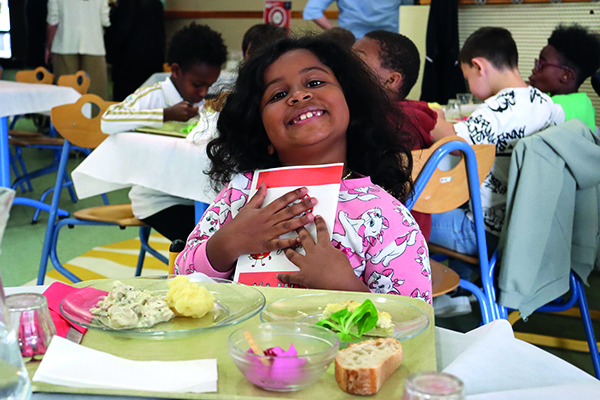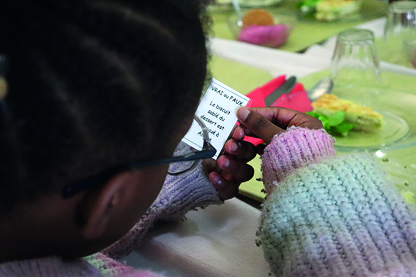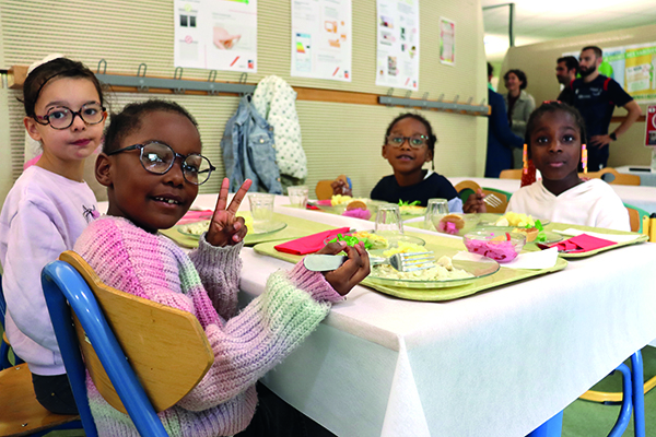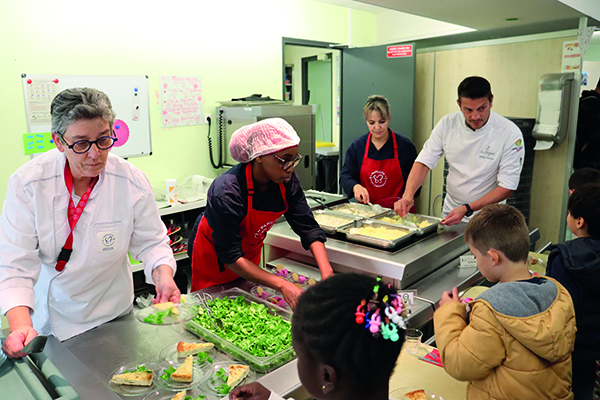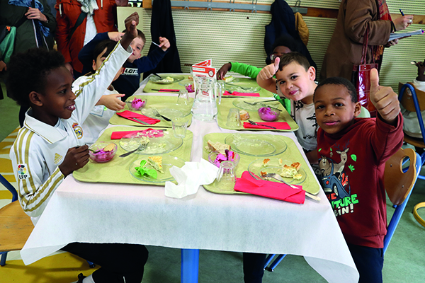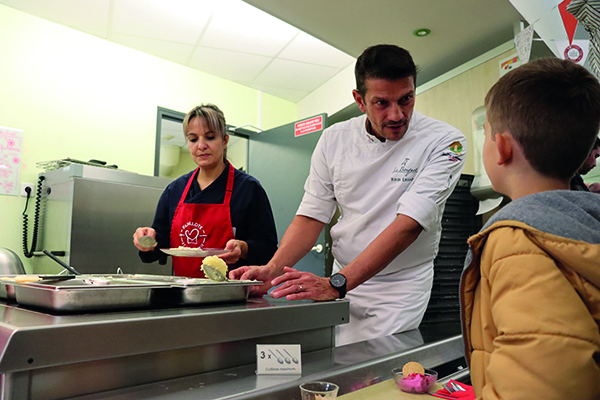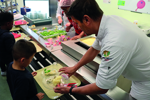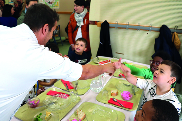 C’était notamment le cas sur l’école Jules Verne où les petits plats étaient mis dans le grands pour l’occasion. Couverts élégamment présentés dans des serviettes rouges. Tables nappées de blanc. Menus affichés sur les tables. Et le chef Régis Legain sur la ligne de self, aux premières loges pour voir la réaction des enfants à la découverte de ses créations. Un repas automnal avec cette tarte à base de choux en entrée, gourmand avec une purée façon Robuchon et un dos lieu noir délicatement enrobée de sauce poulette, et coloré autour d’un dessert au chocolat blanc d’un rose éclatant apporté par du concentré de betterave et un joli coulis de framboise. De véritables explosions de saveurs appréciées à leur juste valeur par les jeunes convives de l’école, ravis de ce midi « comme au restaurant ». Un vrai régal entrecoupé de courtes animations proposées par Papillote et compagnie afin de mettre en avant les produits cuisinés ce jeudi ainsi que leurs origines. Une journée assez exceptionnelle qui se poursuivait jusque dans les cuisines du Bosquet aux Ponts-de-Cé, où le même menu était à la carte ce midi pour les clients.