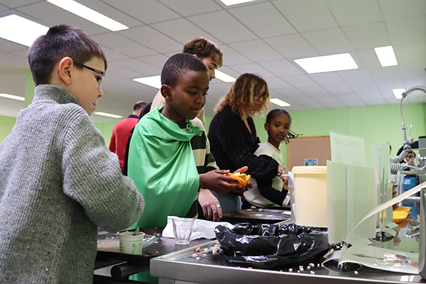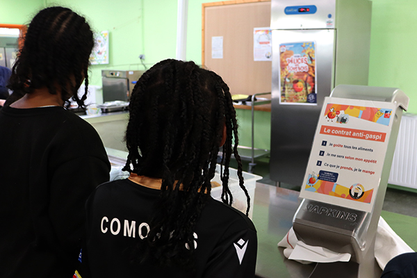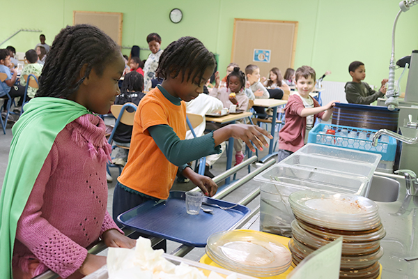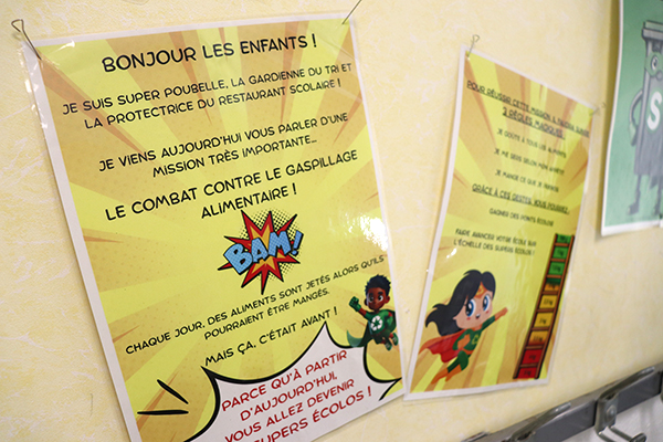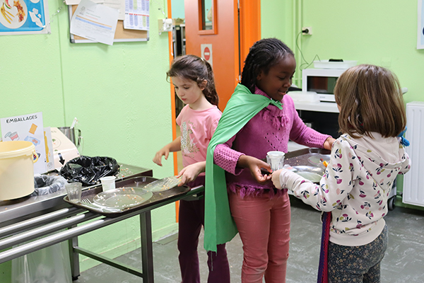 Avant même l’entrée dans la salle de restauration, le ton est donné avec le lancement de l’hymne musical entonné par super-poubelle, la mascotte du gaspillage alimentaire. Puis c’est l’heure de consulter le gachi-mètre qui montre le relevé des pesées alimentaires. « Nous pesons tous les déchets alimentaires chaque jour », explique Pauline Bodin, la responsable d’unité éducative de l’école élémentaire. « Cela permet aux enfants de savoir chaque semaine la quantité jetée et de gagner des points écolos si le résultat est meilleur que la semaine précédente ». Un bon moyen de sensibiliser tout le monde avant le passage sur la ligne de self où de nombreuses actions sont déployées conjointement par les serveuses de Papillote et compagnie et les animateurs de la Ville d’Angers pour réduire le gaspillage alimentaire (voir ci-dessous). Un travail collaboratif essentiel pour la réussite du projet.