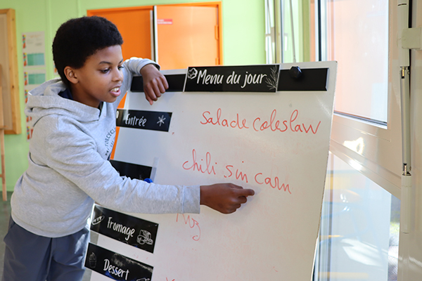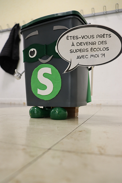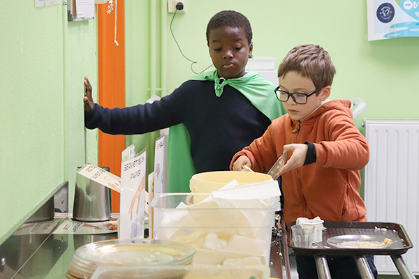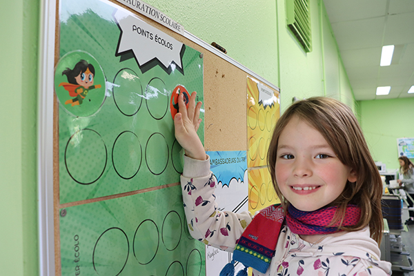 Sitôt le repas terminé, les enfants sont invités à débarrasser leur plateau. A leurs côtés, 2 super-héros volontaires et reconnaissables à leur cape verte, sont présents pour inciter chacun à bien trier ses déchets. Surveiller, aider, accompagner… nos super-héros veillent au grain avec beaucoup d’application pour vérifier que les déchets aillent bien dans la bonne poubelle et que les plateaux soient correctement vidés et rangés. Tout au long du service, ils sont ainsi 4 à 6 à se relayer du CP au CM2 pour s’assurer de cette mission qui suscite toujours beaucoup d’enthousiasme et de bonne volonté. Un investissement salué par l’obtention de bons points écolos qui sont eux-aussi affichés dans la salle de restauration. « D’autres actions quotidiennes permettent aussi de gagner des points comme le nettoyage de la cour par exemple », explique Pauline. « Les bonnes initiatives sont récompensées et les bons comportements valorisés ». De quoi mesurer les résultats en temps réel chaque jour avec le remplissage de ces tableaux des points, différentes pour les CP/CE1/CE2 et les CM1/CM2. Un petit challenge supplémentaire pour tendre vers des résultats toujours plus significatifs.