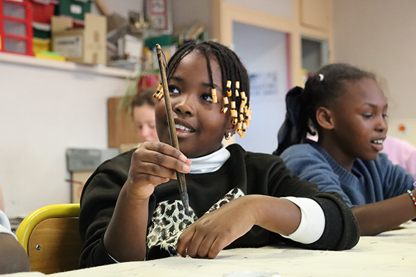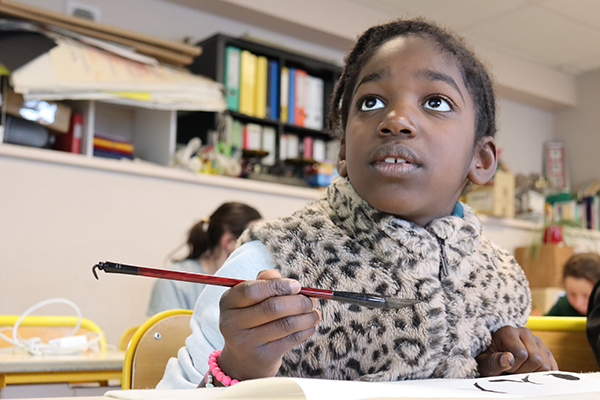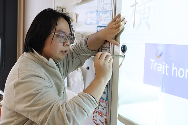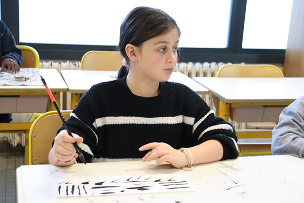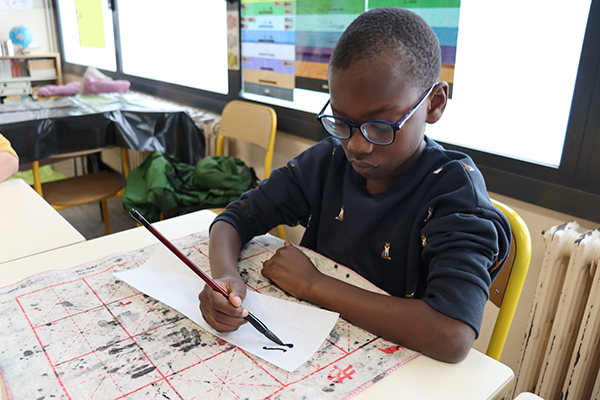 Tout commençait donc par une introduction aux outils nécessaires et la présentation des 4 trésors du Lettré : le pinceau (筆 bĭ), l'encre (墨 mò), le papier (紙 zhĭ), et la pierre à encre (硯 yàn). De vraies découvertes pour les enfants qui ont appris par exemple que le manche du pinceau est bien souvent en bambou et les poils en laine de chèvre ou de loup, que le papier de riz est obtenu à partir d’écorce et de paille de riz ou encore que l’encre traditionnelle utilisée n’est pas initialement liquide mais le résultat du frottement d’un bâton solide de résine et de suie, sur une pierre à encre. Un préambule ludique avant de passer aux exercices pratiques et à l’écriture des traits essentiels comme le trait horizontal, le descendant, le jeté ou l’appuyé. Pinceaux à l’appui – avec une prise en main pas si simple qui diffère de celle du crayon -, chacun s’appliquait alors à reproduire à l’encre les différents caractères du mieux possible sous les conseils et les encouragements de leur professeur du jour. Minute après minute, les feuilles de riz se noircissaient pour le plus grand plaisir de nos sinophiles, curieux de réussir du mieux possible les différentes figures proposées. Une initiation qui se concluait par un quiz pour tenter de découvrir les significations de quelques idéogrammes simples comme la lune, le soleil, la chèvre, l’eau ou encore le feu. Une très belle immersion au cœur de la culture chinoise qui va se poursuivre avec Séverine, leur animatrice, jusqu’à la fin décembre, puis sur les écoles De Musset, Gasnier, Pagnol, Dacier, Lebas ou encore Bois de Mollières dans les mois à venir.