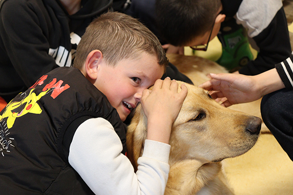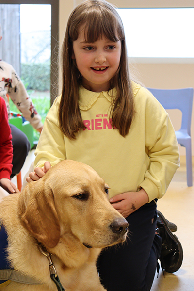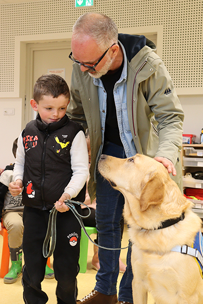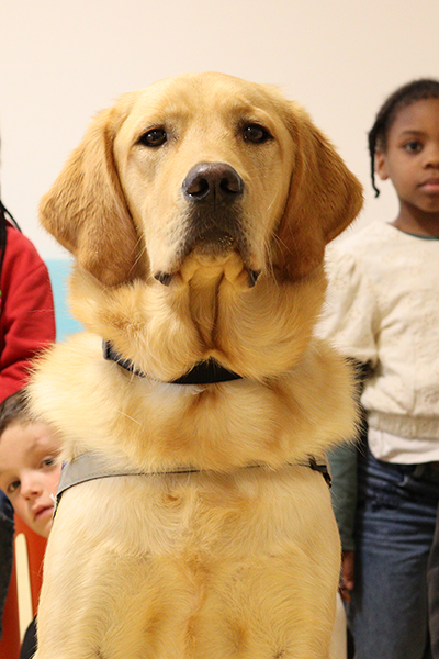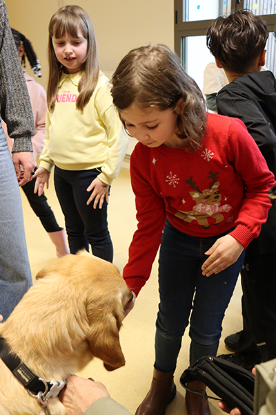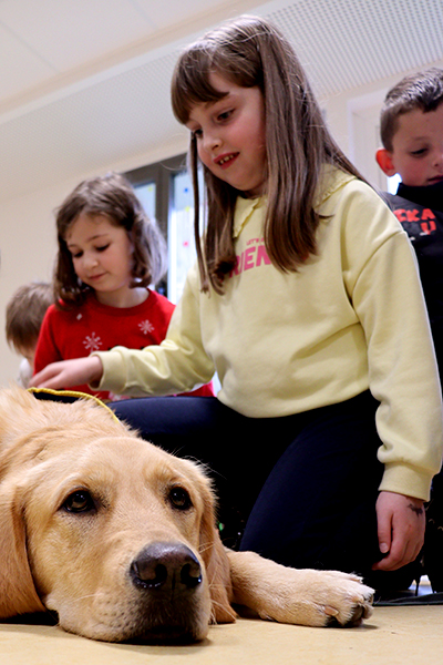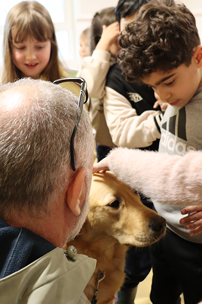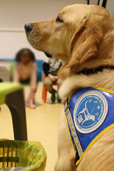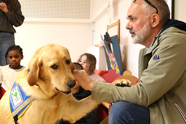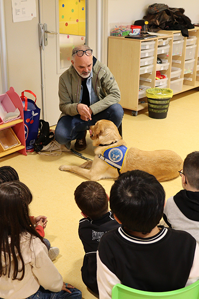 Prévue de longue date, cette séance TAP en présence d’un jeune chien-guide d’accompagnement était particulièrement attendue par le groupe d’enfants de l’école Gérard Philipe. Un véritable événement pour la petite vingtaine d’élèves, mais aussi pour l’animatrice en charge de ce cycle consacré au handicap depuis le mois de janvier. Après un bref rappel des consignes en début de séance — pas de course, pas de cris, notamment — Athos a pu faire son entrée devant un public à la fois attentif, impressionné… et déjà conquis par le jeune chiot. « Athos a rejoint notre famille quand il avait deux mois », explique Stéphane, son maître. « Il a maintenant un peu plus d’un an et, depuis quelque temps, il se rend chaque jour à l’école des chiens pour apprendre à devenir chien-guide, avant de rentrer à la maison avec nous le soir. » Le parcours de formation d’un chien-guide repose sur un partage essentiel entre les professionnels et la famille d’accueil. Les premiers assurent l’apprentissage des bases d’obéissance et des règles de “savoir-vivre” indispensables à tout bon chien de compagnie — marche en laisse, propreté, rappel… — tandis que la famille d’accueil joue un rôle déterminant dans sa socialisation. Elle l’aide à découvrir des environnements variés, ceux qu’il sera amené à fréquenter tout au long de sa future vie de chien-guide. « Venir vous voir aujourd’hui est un très bel exercice pour Athos, qui entre pour la première fois dans une école. C’est un entraînement pour son futur métier, comme lorsque nous lui apprenons à éviter les obstacles, à traverser une rue, à prendre le bus ou encore à monter dans un ascenseur… » Obéissant, calme et apaisant, Athos a réussi sans difficulté son baptême du feu auprès des enfants. Captivés, ils ont multiplié les questions : « Il a un papa et une maman ? », « Qu’est-ce qu’il apprend à l’école ? », « Est-ce qu’il va encore grandir ? » Autant d’interrogations spontanées, entre deux caresses pleines d’affection et de tendresse. Ces temps d’échange, riches et sincères, ont été ponctués de courtes démonstrations permettant de mesurer les progrès d’Athos : aller chercher sa laisse, attendre avant de manger ou encore rester bien au pied de son maître. Les enfants ont même pu participer à certains exercices pratiques, en parcourant la salle avec Athos en laisse ou en lui donnant à manger. De beaux moments de complicité, appréciés à leur juste valeur par les élèves, un peu déçus de voir la séance s’achever si vite. « Athos a déjà bien travaillé aujourd’hui », sourit Stéphane. « Ce temps passé avec vous l’aidera sûrement à obtenir son certificat d’aptitude au guidage, prévu lorsqu’il aura deux ans. » Athos pourra alors rejoindre sa nouvelle famille, auprès d'un enfant de 8 à 12 ans présentant un trouble du neurodéveloppement. Une perspective à la fois belle… et forcément émouvante. « Mais vous allez être triste quand il va partir, non ? », lance une jeune fille en fin de séance. Une vraie question piège pour conclure cette belle rencontre.